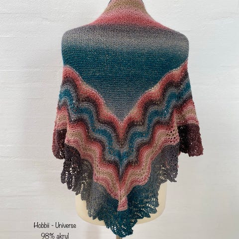 Halstørklæde sjal strikket i ren ny uld i turkise og blå farver. Kradser ikke. Afhentes i Farum eller Ørestad syd eller sendes for købers regning.