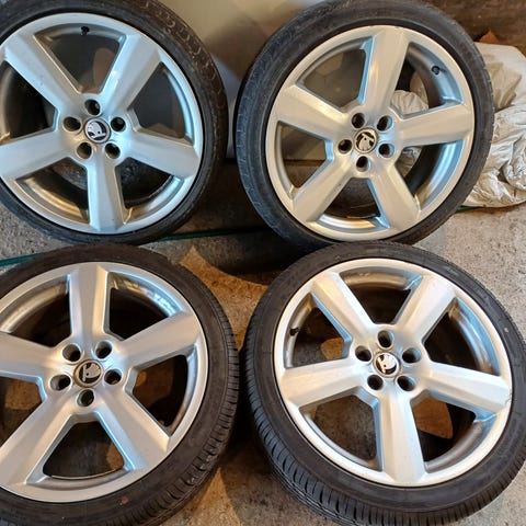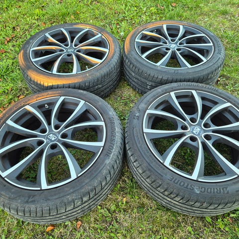 De er monteret med helt nye dæk, dog i lidt forskellige størrelser, men bør ikke være noget problem. 2 stk. Yokohama 235/40R18 og 2 stk. Seiberling 225/45R18. Kan evt. montere så der er ens størrelser på alle 4 hvis det ønskes mod merpris.