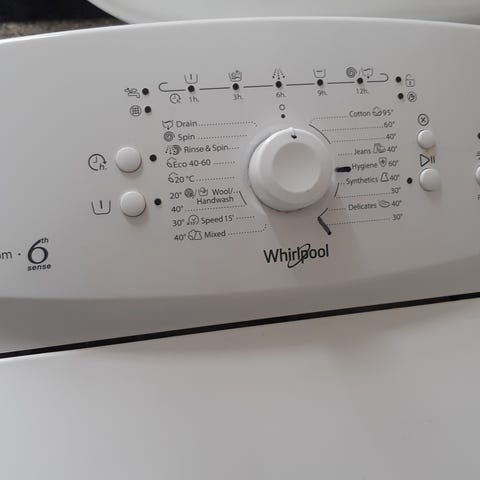 Whirlpool frontbetjent vaskemaskine med forskellige vaskeprogrammer, herunder syntetisk, delikat, uld, blandet, hvidt, bomuld, sport og dyne. Udstyret med dampfunktion til fjernelse af lugte og folder. Maskinen har en drejeknap til valg af program og en frontåbning for nem adgang.