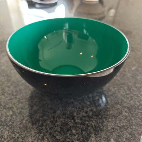Holmegaard glasskål designet og signeret af Anja Kjær. Blæst i sort opalglas med grøn inderside og sort yderside.