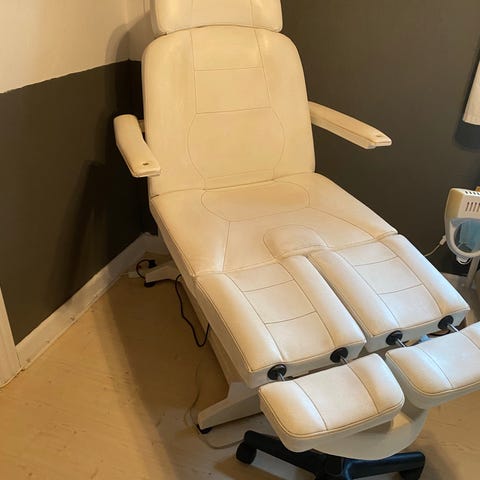 Behandlingsstol med hvid polstring og metalstel. Stolen har justerbar højde og ryglæn med udskæring til hoved. Egnet til klinik- eller skønhedsbehandlinger.