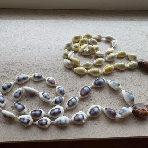 Sælger to håndlavede halskæder af kohorn/knogle, i smuk mælkehvid farve.
