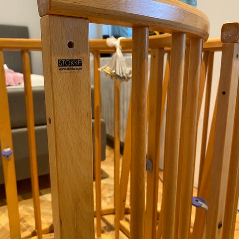 Stokke Tremmeseng børneseng. Sengen har en træbund og kan foldes sammen for nem opbevaring eller transport. Sælges uden madress