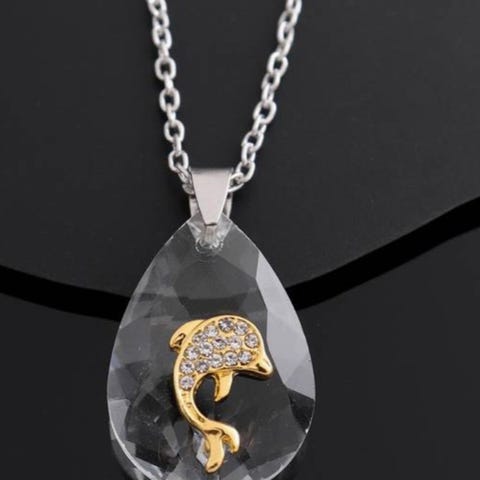 Beautiful necklace with a decorative dolphin pendant and a deep blue stone. The necklace features a black cord with a metal clasp, offering a simple, boho-inspired look. The pendant shows two dolphins encircling a blue stone, giving it an elegant and ocean-themed appearance.