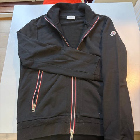 Moncler Herre Trøje i størrelse S. Trøjen er grå. Den har en enkel design med en diskret stribe over brystet og ribkant ved ærmer og bund.