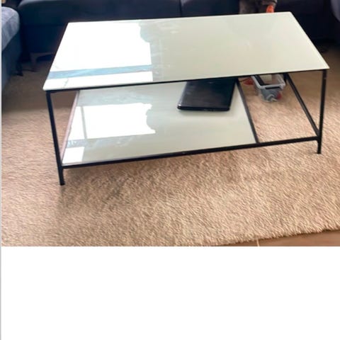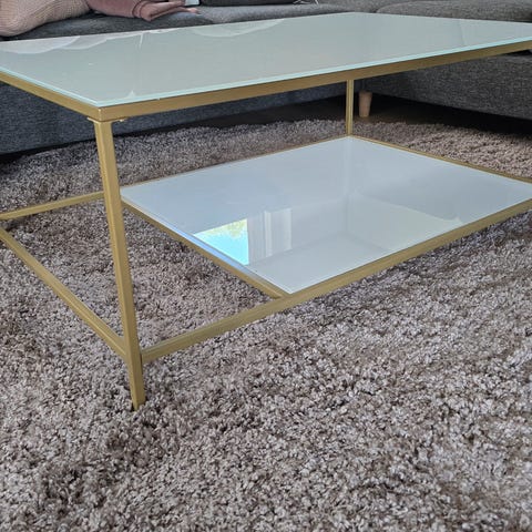 Sofabord med hvide glasplader og stel i “guld” metal.