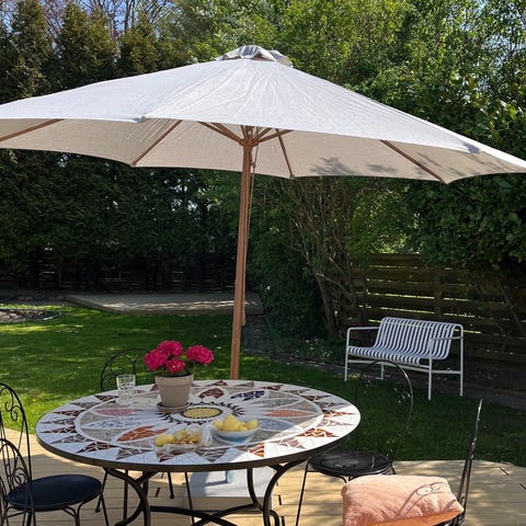 Den perfekte parasol med tung betonbase på hjul. Kan modstå kraftig vind. Fx på altaner.
