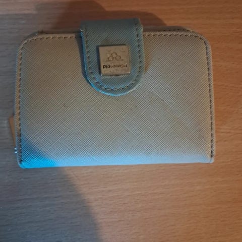 Stilfuld lille pung/kortholder i lyseblå og cremefarvet kunstlæder fra Picardesign. Pungen måler ca. 12 cm i længden, 9 cm i bredden og 3 cm i højden, og vejer omkring 109 g. Den lukkes med en trykknapstrop og har en solid lynlås i siden. Fremstår i rigtig pæn stand med minimale brugsspor.
