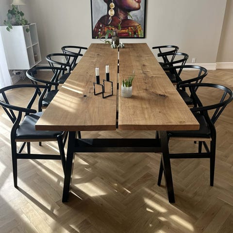 Stort spisebord med q0 stole og 2 plader massivt egetræ