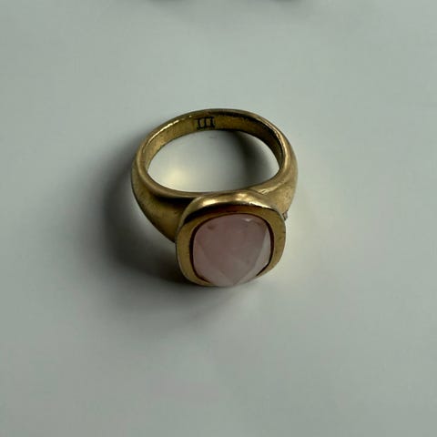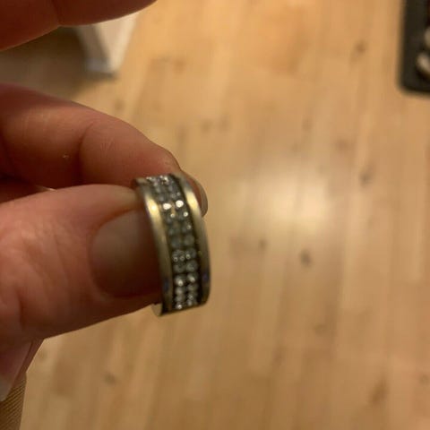 Ringen er lavet af metal og er guldfarvet. Men det er IKKE guld. Der er små glas sten i. Produceres ikke længere.