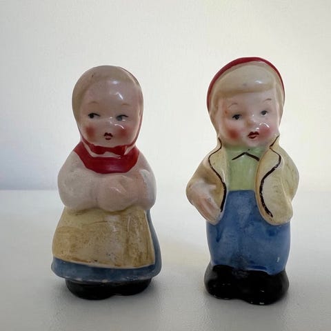 Et sæt salt/peber i keramik, forestiller 2 børn, en pige og en dreng. Uden brugsspor.