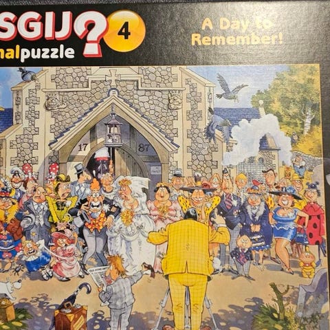 WASGIJ Original Puzzle med 1000 brikker. Motivet viser en farverig og detaljeret scene med mange figurer i en travl og humoristisk situation. Puslespillet udfordrer brugeren til at samle billedet ud fra ledetråde snarere end det viste motiv.