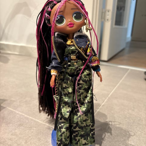 L.O.L. Surprise O.M.G. Remix dukke med pink og sølv outfit, inklusiv jeans, støvler, jakke, hårbøjle og diverse tilbehør. Dukken har langt hvidt hår og leveres med stander. Velegnet som legetøj til børn.