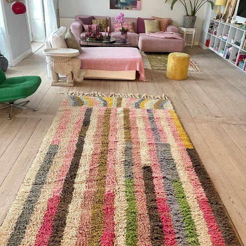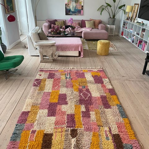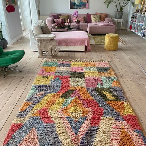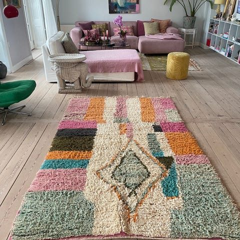 Smukt vintage berbertæppe fra Marokko i fine farver. 100 % uld, helt uden pletter og nyrenset.
