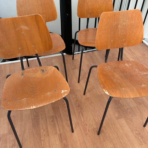 To skole stole sælges. Den ene har lidt malingspletter, den andre har er lidt løst sæde.