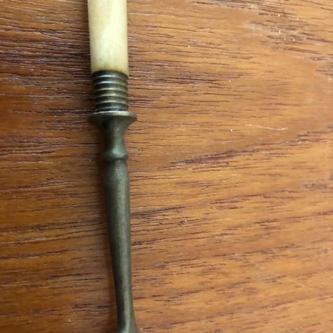Bemærk den fine udskæring i skaftet med hyrdinden og skorstensfejeren