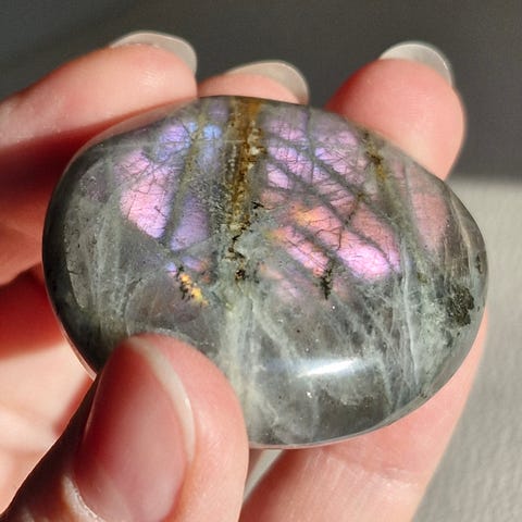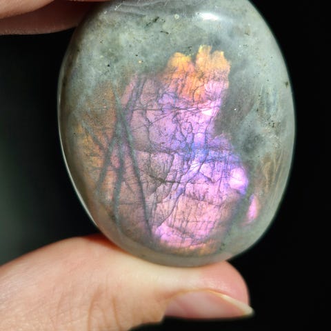 Smuk sunset labradorit som er lilla på den ene side og har regnbue effekt på den anden. Måler ca. 4,8cm og 75g.