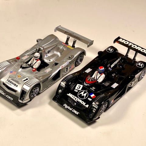 Scalextric analog racerbane 1:32 med 2 stk Formel 1 biler, transformator med 2 controllere, 1 strømskinne, 2 lige skinner med kryds, 16 lige skinner, 8 buede skinner SCX 3051 og 4 buede skrå skinner Hornby 05949 med autoværn