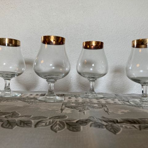 9 cognacglas, 7 portvinsglas og 5 sodavandsglas med guldkant sælges samlet for 200 kr.