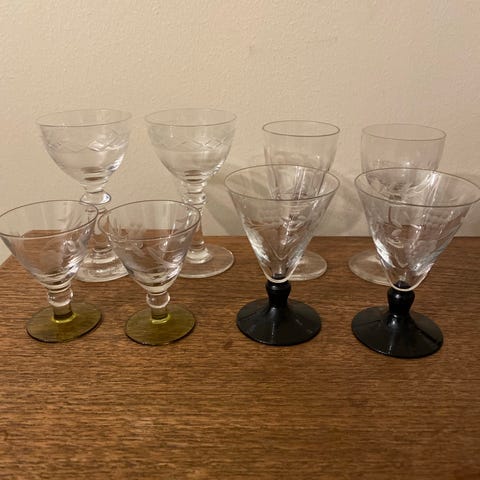 Holmegaard likørglas 4 stk koboltblå ottekantet kumme, rund stilk, flad fod, H: 8,4 cm, D: 4,9 cm, 1964 sælges samlet ialt