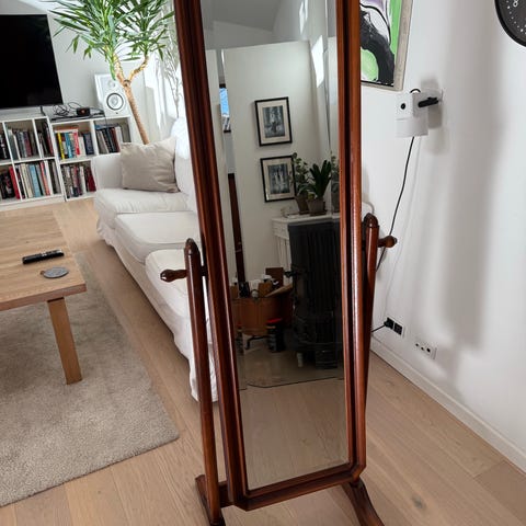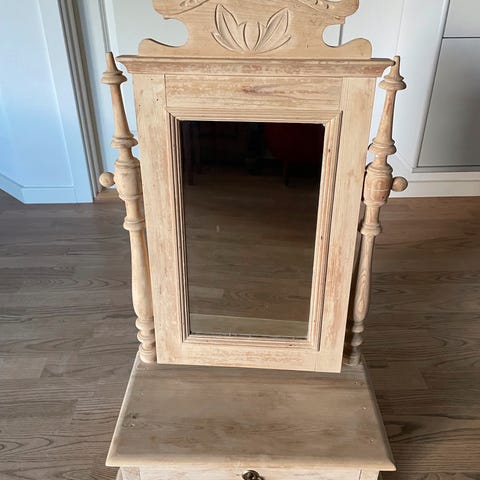 Et gammelt vippespejl med skuffe, er i fyretræ som er mørk bejset (originalt ) to fine snoede stænger og et originalt spejl, lige noget for Drew Prichardt ( spejl pest ) , mål 50 x 33 x18. Søgeord! Antik, indbo, samler, møbel møbler, indretning , pynt, Deco , dekoration, SENDER KUN MED DAO ELLER AFHENTNING.
