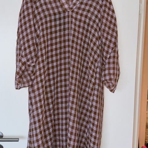 Selected Femme hverdagskjole i størrelse 42. Kjolen er orange og lavet af polyester. Den har lange ærmer med detaljer ved ærmekanterne og en knappelukning foran. Designet er enkelt med lodrette folder på overdelen.