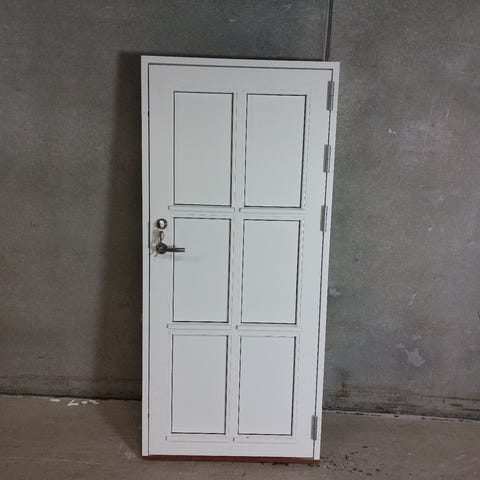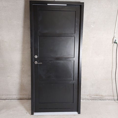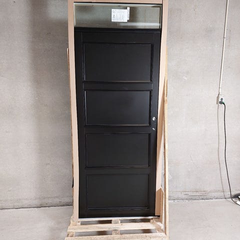 Facadedør med overparti i træ med 3-lags energirude, fire fyldninger, lavt glasfiberbundstykke og 3-punktslås. Der er monteret vrider inde og låsecylinder ude, nøgler og greb medfølger løst. Har nogle limrester på udvendig side, se billede. Outlet pr