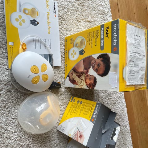 Medela Solo elektrisk brystpumpe med tilbehør, herunder flasker, to ekstra opsamlingsbeholdere og ekstra brystskjold. Produktet er designet til mødre til at pumpe mælk effektivt og komfortabelt. Indeholder flere flasker og reservedele til brug sammen med brystpumpen. En pakke uåbnet ammebrikker str. M