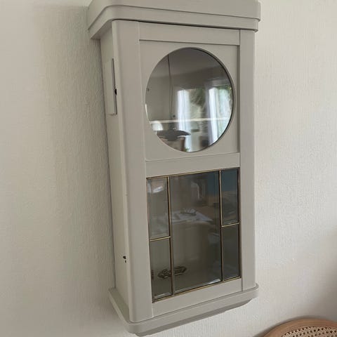 Lille vitrineskab indrettet i gammel urkasse, fin til udstilling af din ur samling, smykker eller andet små ting, mål: B: 20 / 32,5 x D: 16,5 x H: 73 cm.