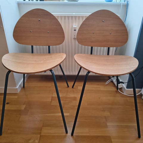 Meget behageligt rygstøtte - i træ. Ben stål. Super fine stole. Højde til armlæn er 67, så stolen kan skubbes ind under et bord hvis der er behov for det. 3 stk sælges samlet for kr. 200,-