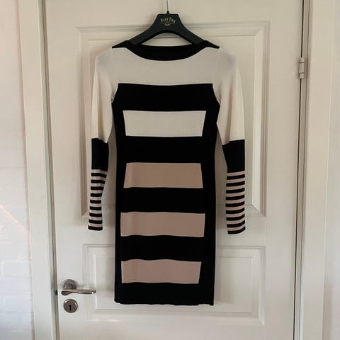 Kjolen er beige med et sort ternet mønster. Den har et bælte i taljen og er designet til kvinder. Karen Millen Hverdagskjole i beige farve, Kjolen har et mønster med sorte tern og er designet til kvinder. Meget smuk kjole fra Karen Millen i str 42 til salg. Blev brugt 2 gange og er rigtig god stand . Str tilsvarende og kan sendes med Dao for 43kr. . Med side lynlås og foer. Længden af kjolen er 130 cm. Kjolen med en virkelig flot snit hvor kjolen går længere ned på ryggen . Pæne end på billederne.fast pris.