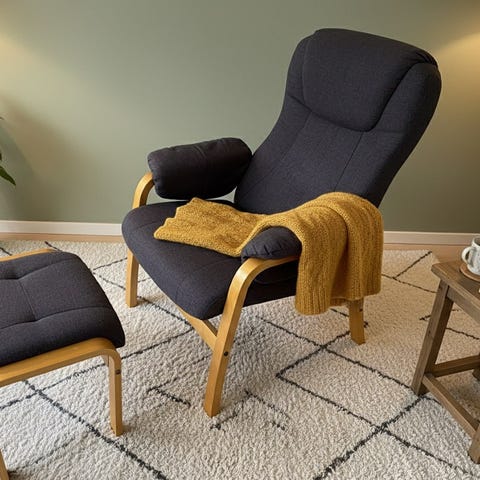 Virkelig behagelig lænestol. Fantastisk god at sidde i. Med nedfældelig ryg. Stolen er beklædt med grønt uldstof.