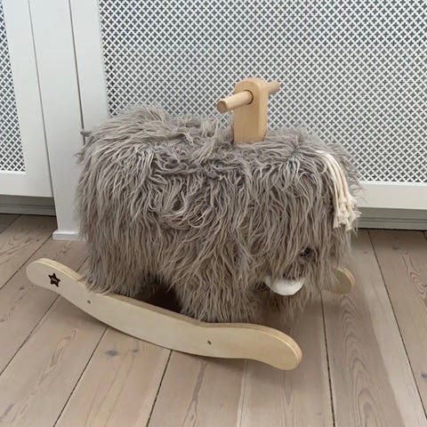 gyngehest i får i sort og hvid. Legetøjet er designet til børn og har en blød overflade, der efterligner et dyr. Gyngedyret er udstyret med en træramme til gyngefunktion.