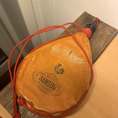 Meget gammel dunk udført i træ og læder. Formentlig brugt til vand eller øl.