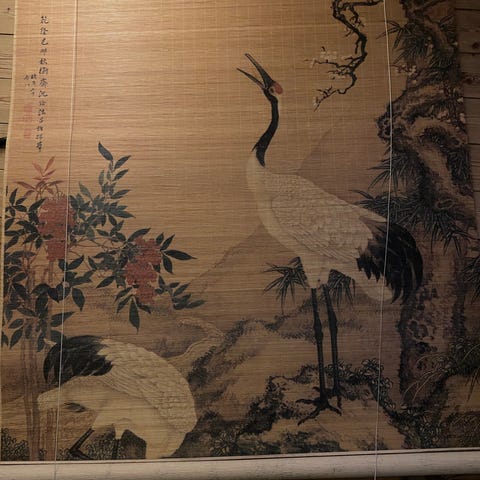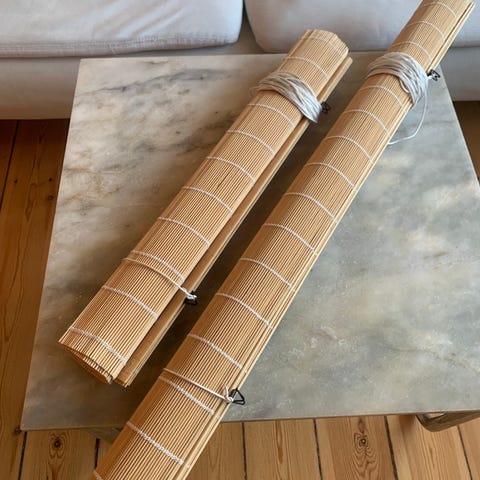 Produktet består af bambus og er et gardin, der ser ud til at være lavet af naturlige materialer. De er bundet sammen med snor og præsenteret i en kasse. Der er også en kurv i bunden, som er flettet. Materialerne giver et rustikt og organisk udtryk.,Afhentes i:,Røde Kors Kolding (621),Bemærk at mail, chat og beskeder ikke besvares, og varen skal købes på knappen "Gå til varen"