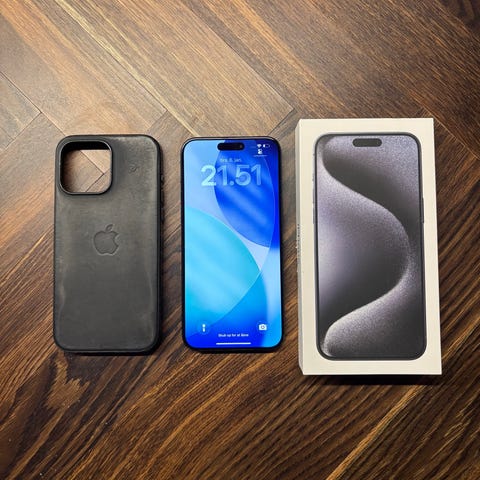 Apple iPhone 15 Pro Max smartphone med 512 GB lagerplads. Enheden er sort og leveres med original emballage, opladerkabel, beskyttelsesglas og et sort cover. Telefonen har avancerede kamerafunktioner og stor skærm, velegnet til både privat og professionelt brug.