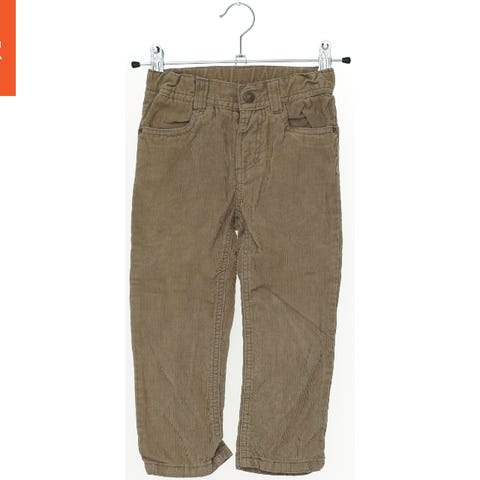 Par fløjsbukser i børnestørrelse, primært khaki-farvet. Bukserne har flere praktiske lommer, både foran og bagpå, samt på siden af benene. De er designet til komfort og holdbarhed, og kommer med bæltestropper og en knaplukning. Ideelt til udendørs leg og aktiviteter.