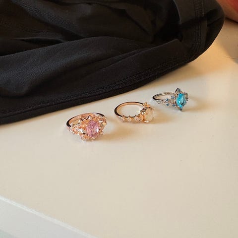 Dette er et sæt af to ringe. Den første ring har et guld design med små indlagte klare smykkesten og et mønsterformet design. Den anden ring har en enkel gylden bånd med en rund sten omkranset af klare smykkesten. Størrelse er 56 mm.