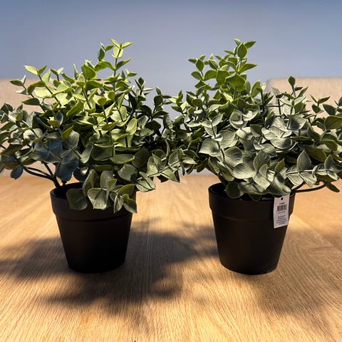 To dekorative planter med realistiske grønne blade, der er placeret i grå potter. Planterne har detaljerede, hjerteformede og perforerede blade, der tilføjer et naturligt touch til indretningen. Potterne har en enkel, minimalistisk stil, som passer ind i de fleste rum. Begge planter har en størrelse på hver 25 cm i højden.