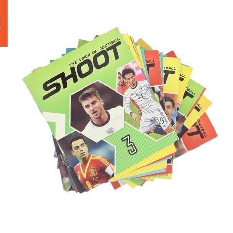 En samling af Shoot fodboldmagasiner. Magasinerne har forskellige covers med fodboldspillere og er i forskellige farver som gul, orange, blå og grøn. Bagsiden af magasinerne viser generelle informationer om indholdet. Størrelsen er 12x10 cm.