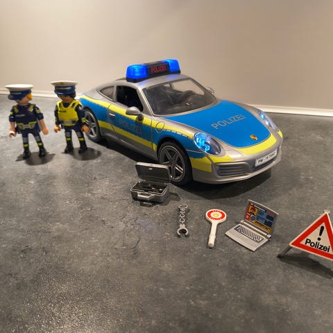 Politibil måler 25 cm lang og 14 cm høj med chauffør