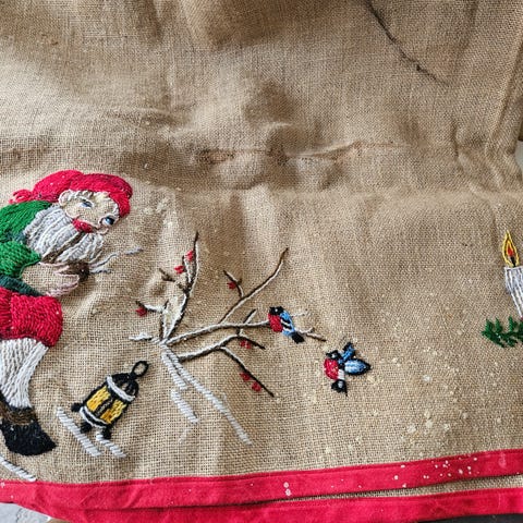 Ældre og nydeligt og unikt Juletræstæppe, som ser ud som det aldrig har været brugt. Håndsyede nisser og gran oa. 123 x 123 cm, som så passer under et juletræ.