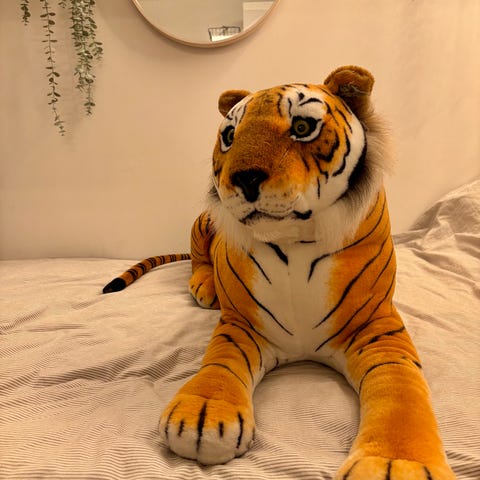 Dette er et hvidt tiger tøjdyr med sorte striber og klare blå øjne. Det er lavet af blødt stof og er cirka 35 cm langt. Tøjdyret er designet til at ligne en tiger og har detaljer som en lang hale og et realistisk ansigt.