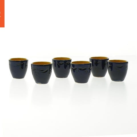 Sættet indeholder tre ens kopper, som er lavet af keramik, og de er alle glaserede i en dyb blå farve. Hver kop har en enkel rund form med en stabil base og en let buet hank, som gør dem lette at holde. De indre og ydre overflader er glatte, hvilket gør dem nemme at rengøre. Kopperne har en størrelse på 9 cm i højde, hvilket gør dem perfekte til at nyde en lille kop kaffe eller te. De har et enkelt design med et monogram på bunden, der tilføjer et diskret flair. Tags: keramik, drikkekop, blå.