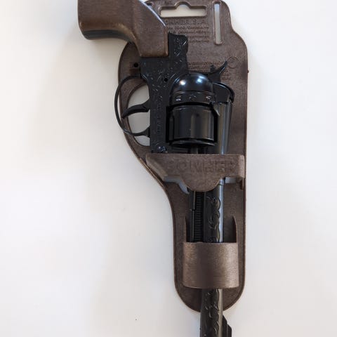 Denne legetøjsrevolver er lavet af metal og plast, og har en størrelse på 22 cm. Den har et sølvmetallisk finish med en brun plastikkrop, der efterligner træ. Revolveren har detaljerede graveringer på metaloverfladen. Den er designet til leg og har ingen egentlige funktioner som en rigtig revolver.