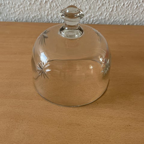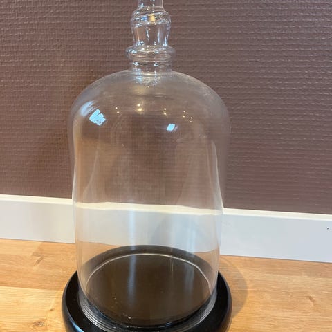 Denne artikel består af en glasklokke med en træbund. Glasklokken har et klart, kuppelformet design med en knapformet top, og passer perfekt på den runde træbund. Der er tegn på brug i form af støv og små ridser på glasset. Bunden er lavet af træ, som giver en naturlig og robust base, der komplementerer glasklokken. Ideel til dekoration eller opbevaring af små genstande.