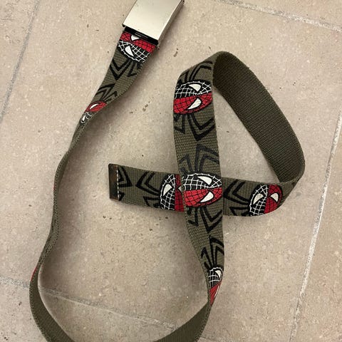 Dette bælte har et Spiderman tema med et logo på spændet og grafiske elementer langs bæltet. Farven er hovedsageligt blå med antydninger af rødt. Bæltet er egnet til børn og måler 75 cm i længden.