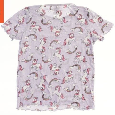 T-shirt i lyserød farve med kort ærme. Den har forskellige dekorative elementer på forsiden, inklusiv blomster, en sløjfe, tekst og en hånd med et nøglemotiv. Bagsiden af t-shirten er ensfarvet og uden print.
