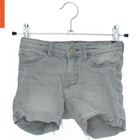 Grå denim shorts med elastisk talje og belteløkker. Shortsene har to sidelommer foran og to baglommer. Knappelukning foran.