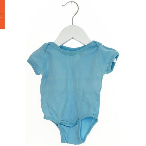 Baby bodystocking i hvid farve med korte ærmer og blå kantdetaljer ved hals, ærmer og benåbning. Den har trykknapper forneden og teksten 'I'm too cute' på forsiden.